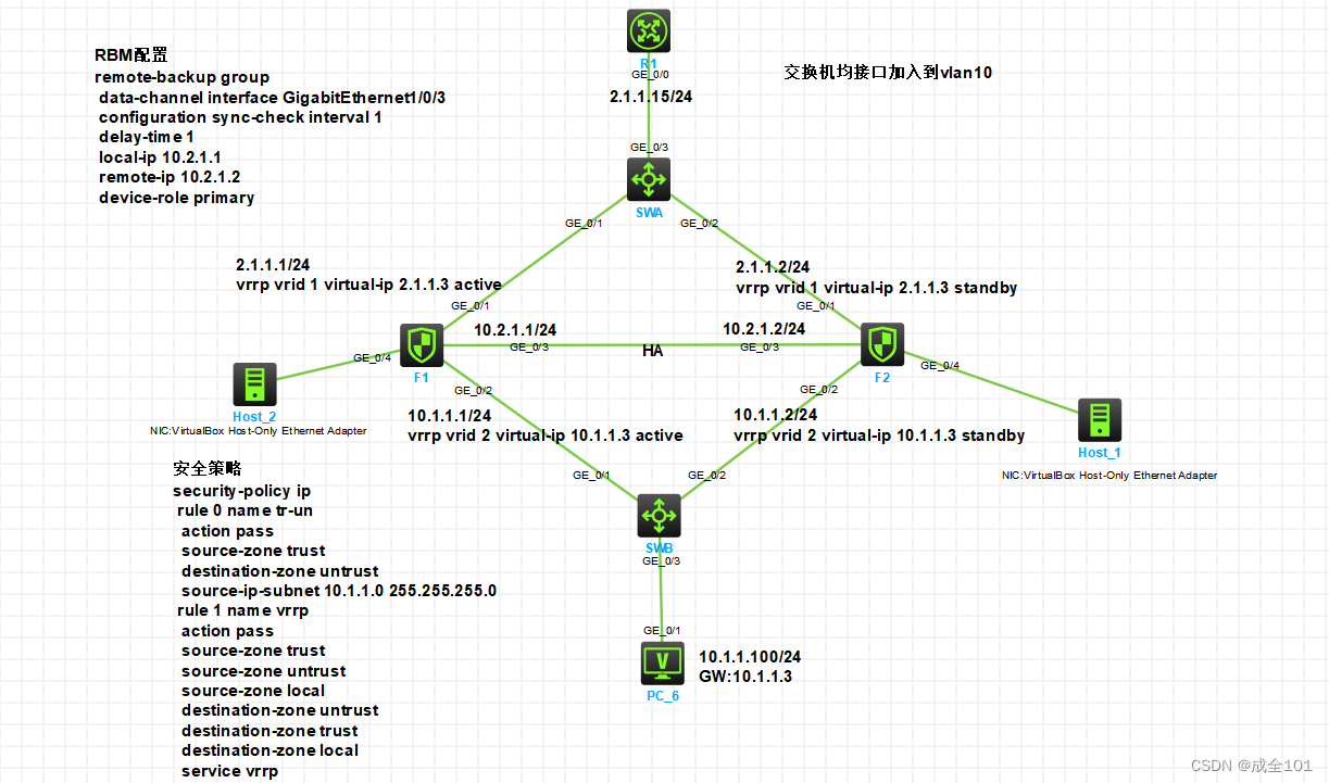 primary:表示设备为HA中的主管理设备。PS:secondary:表示设备为HA中的从管理设备。configuration sync-check interval 1 开启一致性配置检查,1小时检查一次,默认为24小时。standby:设置VRRP备份组与HA关联,当前路由器加入到VRRP Standby组中,设备初始角色为Backup。active:设置VRRP备份组与HA关联,当前路由器加入到VRRP Active组中,设备初始角色为Master。