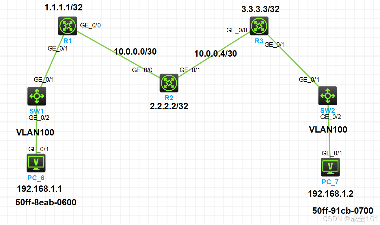 以R1为例,设置为10,默认的SRGB范围为16000那么就是16000+10=16010,其他设备依次为R2是2,R3是30......依靠IGP协议OSPF进行广播,让其他设备节点获知Adj SID(邻接段ID)正常将接口的对应IP宣告到ospf中,R1无需宣告tunnel接口,以下是R1的配置事例,其他设备省略。以R1为例,每台设备将互联接口开启mpls功能,lsr-id配置为设备的loopback地址。4.配置Prefix SID。6.配置MPLS-TE隧道。Prefix SID配置。