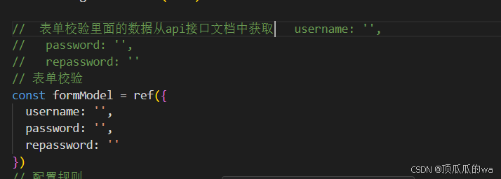 注册---表单校验 然后在el-form表单中绑定之后定义表单规则:定义完规则之后,不要忘了给el-form绑定:给el-input绑定:还有说明生效的是哪个规则:类似与“再输入一次密码”这种,需要自定义校验: