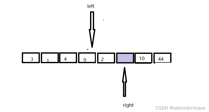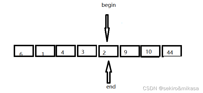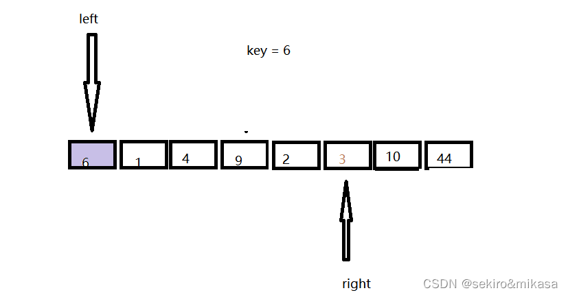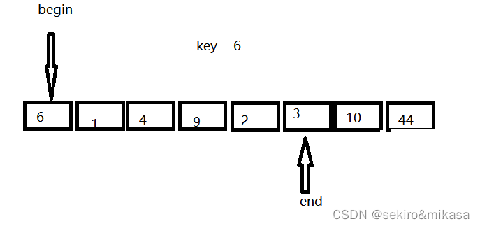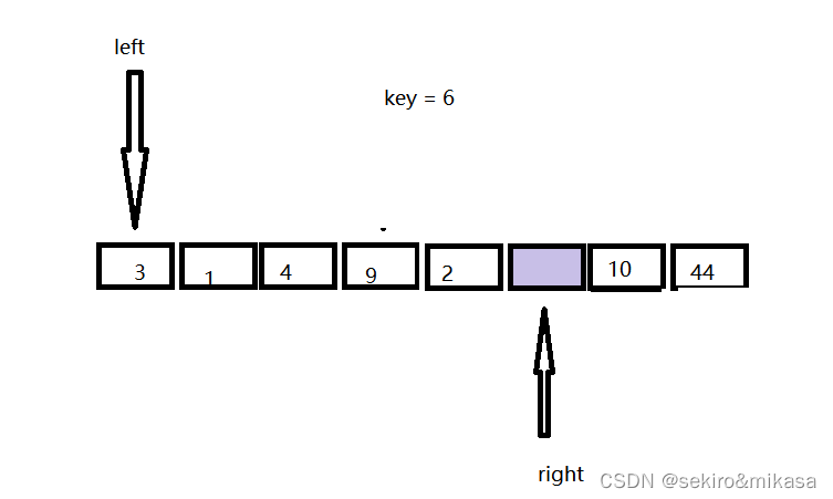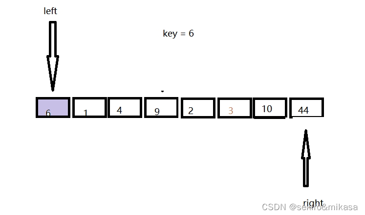 此方法在区间的前后定义两个指针,先从右边的指针进行查询,当遇到一个小key值的时候,就让左边和右边指针所对应的值进行交换,再从左边开始查询,当遇到一个比key大的值的时候就让左边和右边的值进行交换,重复上述操作,直到左边的指针与右边的指针相遇的时候结束,我们把key的值放进两个下边所对应的地方就完成了key的排序的确认,然后进行分治即可。