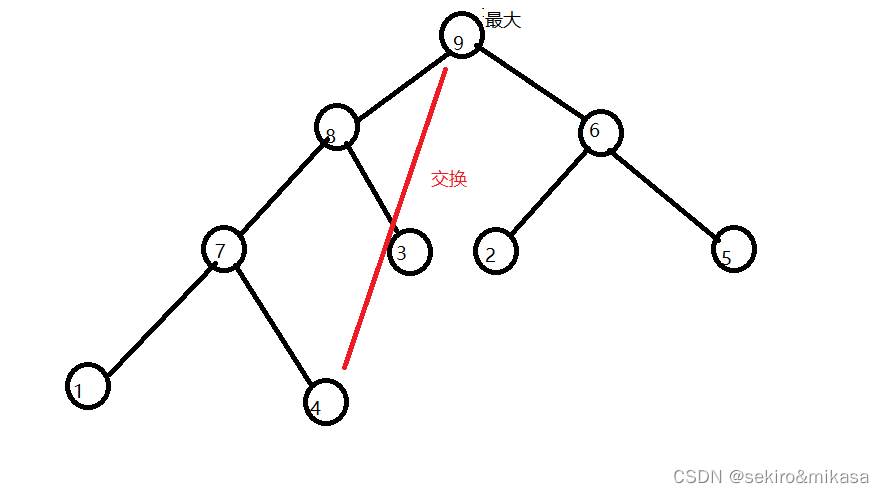 如图,9 和 4 交换完成之后, 长度减一,以减一以后的长度再维护一个大根堆,重复上述的操作,直到长度变为0;