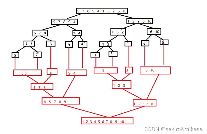 归并排序是把完整的数据每次取中,把分成的两个数据合并成一个有序的数据。