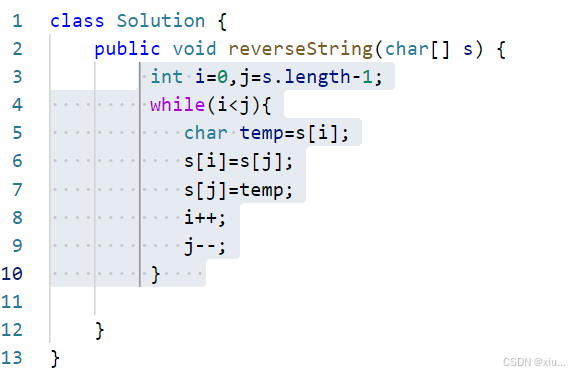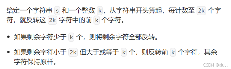 思路:比较绕,简单来说就是规定每2k个单位之中,反转前k个字符。一开始我没搞懂题目,直接以为是每隔2交换字符= = ,但是注意,涉及到单位个这种,也就意味着我们在做反转任务的时候要采取区间模式,借用上一题的代码,改一下参数列表