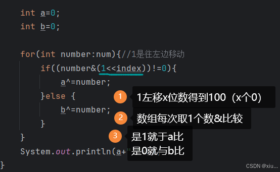 (由于两个不重复的数字在这一位上是不同的,所以它们将被分到不同的组中。每组中的其他数字都是成对出现的,它们在异或运算中会相互抵消。)