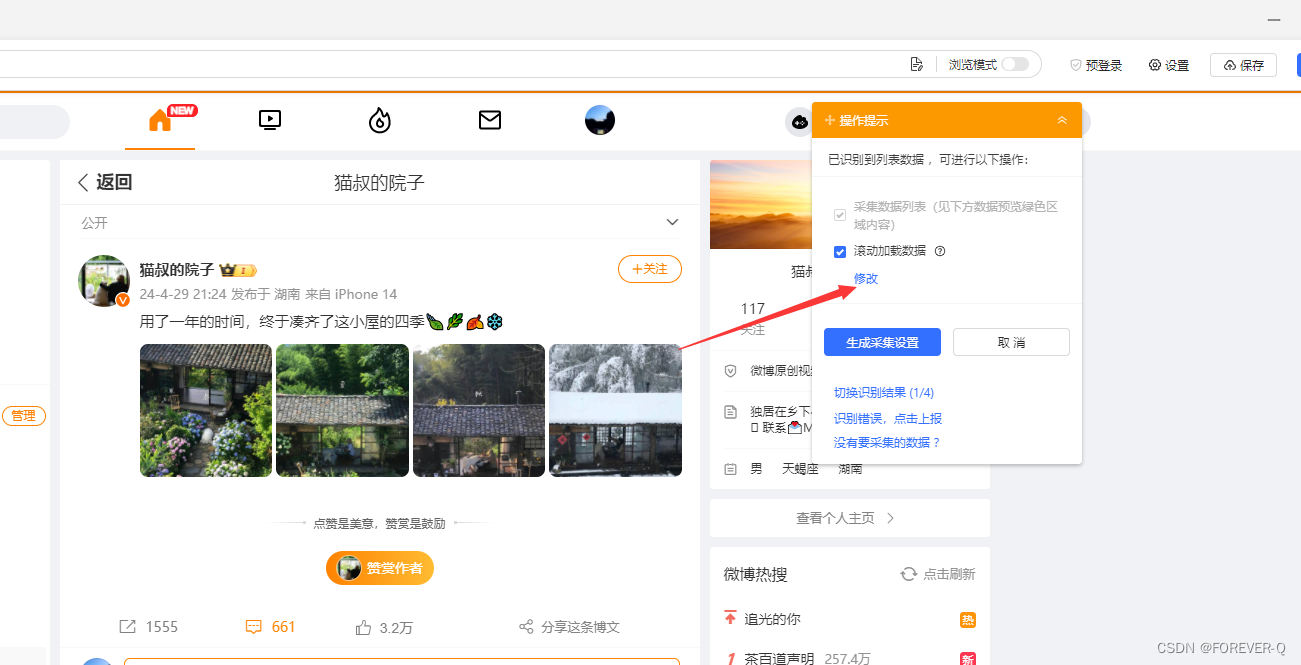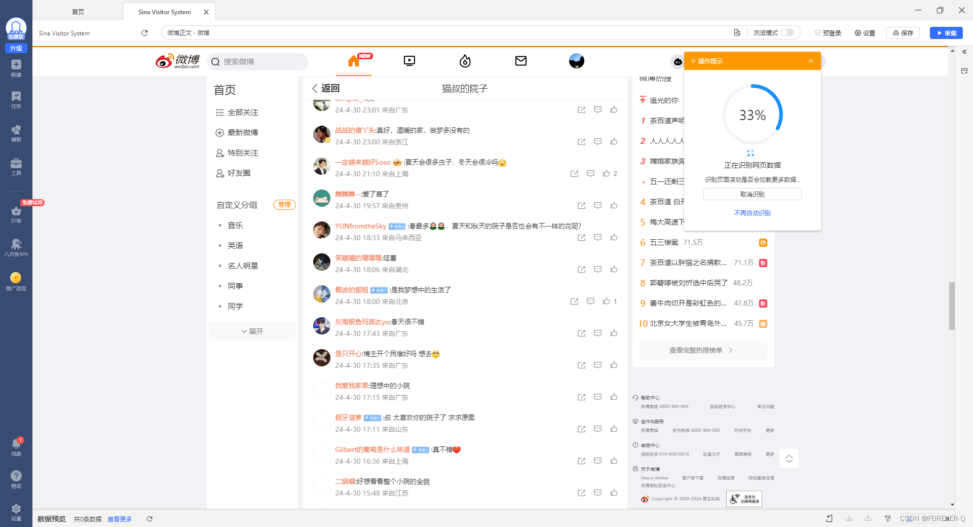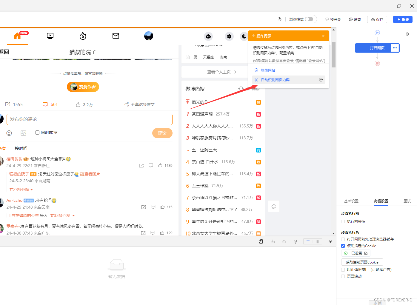 本文介绍了如何通过八爪鱼抓取工具获取微博单条帖子的URL,进行自定义任务设置,登录并保存Cookie保持会话,以及如何调整采集配置、识别网页、生成采集设置、修改字段、添加加载更多功能,最后执行采集并导出数据的过程。
