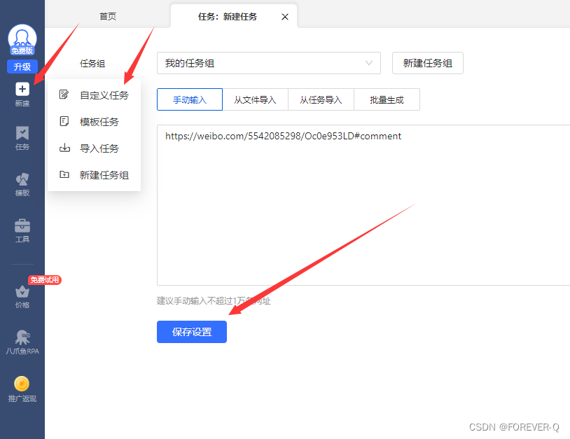 说明:新建中的自定义任务,输入网址后点击保存设置。