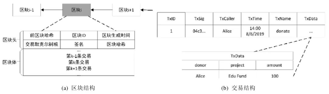 在区块链中,区块包括区块头(block header)和区块体(block body),如图1(a)所示:区块头由前一个区块的哈希值、区块ID、区块生成时间、交易默克尔树根、签名和本区块的哈希值组成;区块体包含多个交易,每个交易由交易ID(TxID)、交易签名(TxSig)、智能合约调用者(TxCaller)、交易时间(TxTime)、交易表名(TxName)和表数据(TxData)组成.图1(b)为一个交易示例,表示用户Alice 调用智能合约中的donate 函数向教育基金项目Edu Fund 捐助了100 元.在SEBDB[4]中,交易表名相当于关系数据库中的表名,表数据包含若干列,相当于关系数据库中的一行记录.