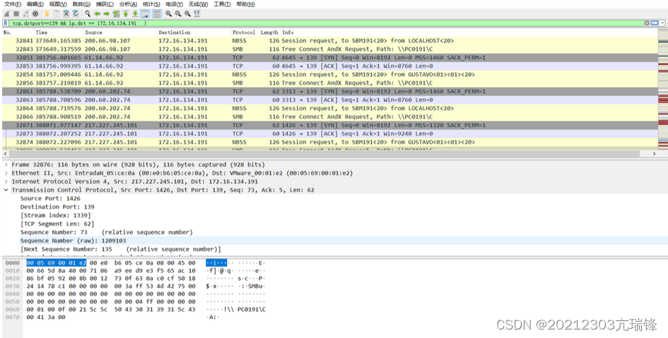 接下来是TCP 139号端口, 虽然有很多连接到这个端口的,但是基本都是一样的,大部分都是连接,然后很多空会话,同样这个也没有成功,这个应该是个SMB查点。