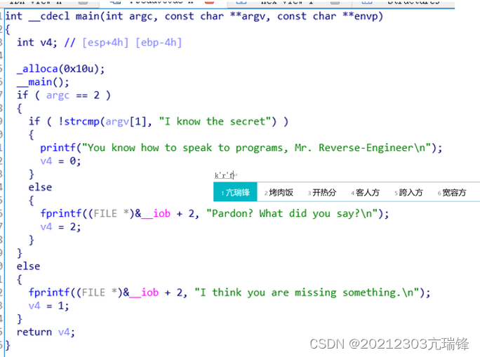 在分析该程序时,我们使用IDA Pro打开后,通过Strings窗口检查程序中的字符串。在这些字符串中,我们发现了之前提到的两种反馈信息:“I think you are missing something.”和“Pardon? What did you say?”。这两种信息我们已经熟悉了,很容易推测出它们的含义:第一种情况可能是参数不正确,而第二种情况则可能是参数数量正确但具体内容不符合要求。
