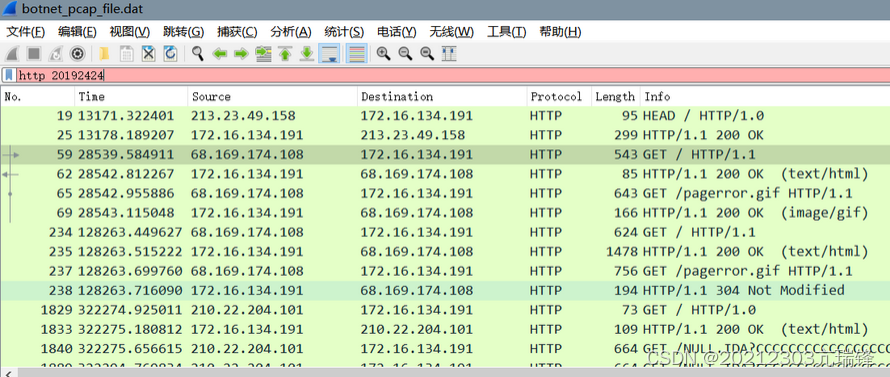 用wireshark监听,受害主机向目标主机68.169.175.168发送了大量的数据包