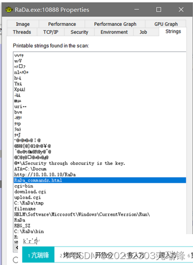 网络连接:恶意程序通过HTTP连接到目标主机10.10.10.10上的名为RaDa_commands的网页,这表明它可能是通过命令和控制服务器(C&C)与攻击者进行通信。这种通信模式通常用于远程控制和命令执行。