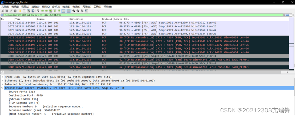 攻击了哪些安全漏洞首先要了解攻击了哪些端口,使用snort -r botnet_pcap_file.dat -c /etc/snort/snort.conf -K ascii指令先查一下网络流分布情况。我们发现大部分都是TCP包,有一部分UDP包,应该筛选出响应的TCP端口和UDP端口。