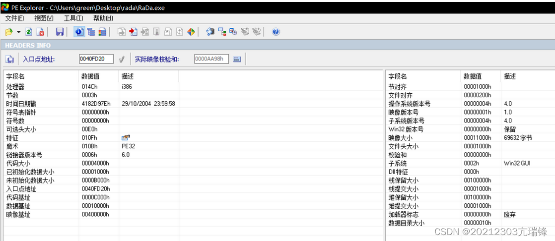 - 文件格式为PE32,运行平台为Win32GUI,我的识别工具为PE Explorer