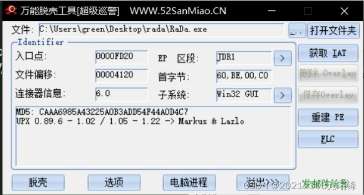 使用超级巡警脱壳机等托克软件,对rada恶意代码样本进行脱壳处理