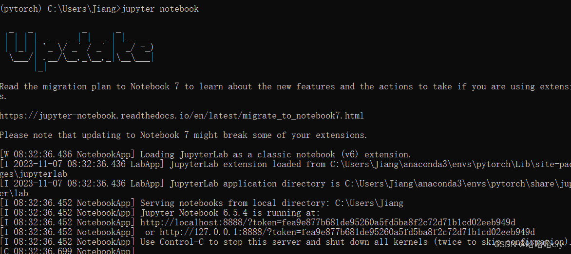 总结:其实主要就是两行命令:activate pytorch和jupyter notebook,不过要注意运行环境是在Anaconda Prompt下,不是在cmd。
