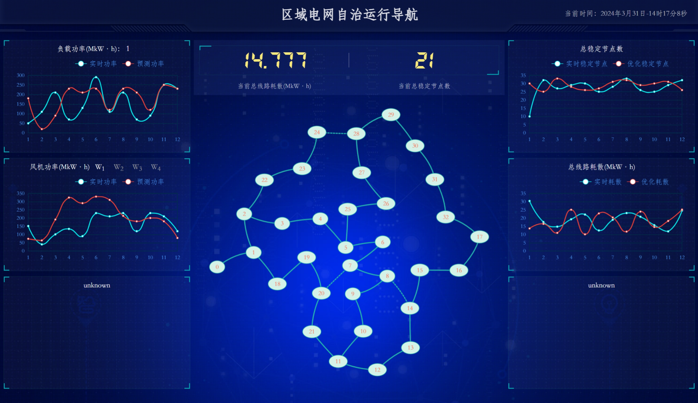 前后端协同的实时数据可视化 基于Flask架构,搭建后端服务器,同时采用SSE机制检测运行数据更新,并实时向前端传递更新数据。前端设计综合采用Vis、Echarts等目前流行的多功能js库用于预测图表、电网拓扑结构的绘制,同时支持实时数据更新、可视化结果保存、实时交互等功能。整体设计注重实时性、鲁棒性、安全性、美观性,以及用户友好性。