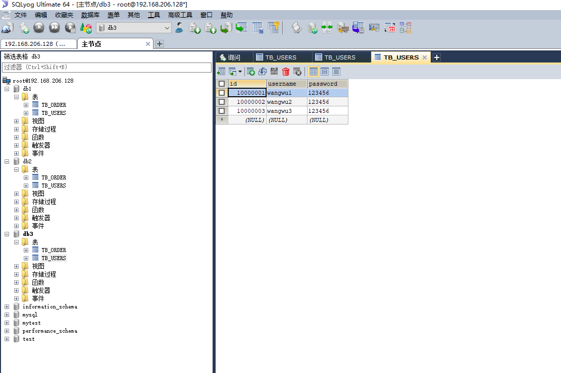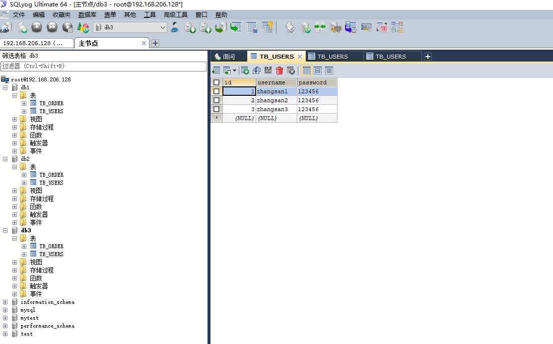 重开一个窗口,连接主节点,依次查看,db1、db2、db3上的TB_USERS、TB_ORDER,你会发现数据是均匀分布的,这就实现了我们最终的分片集群了,具体效果图如下: