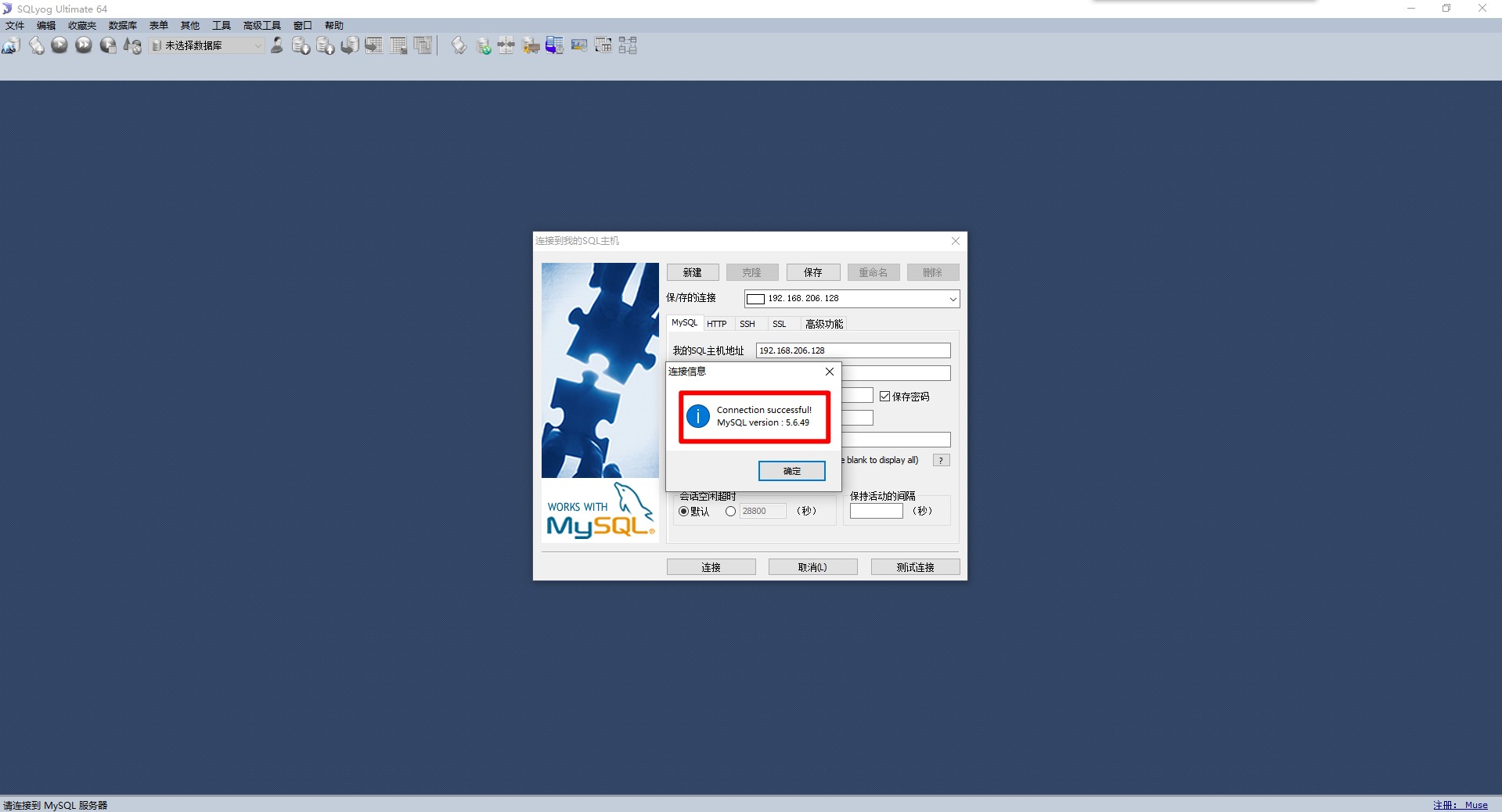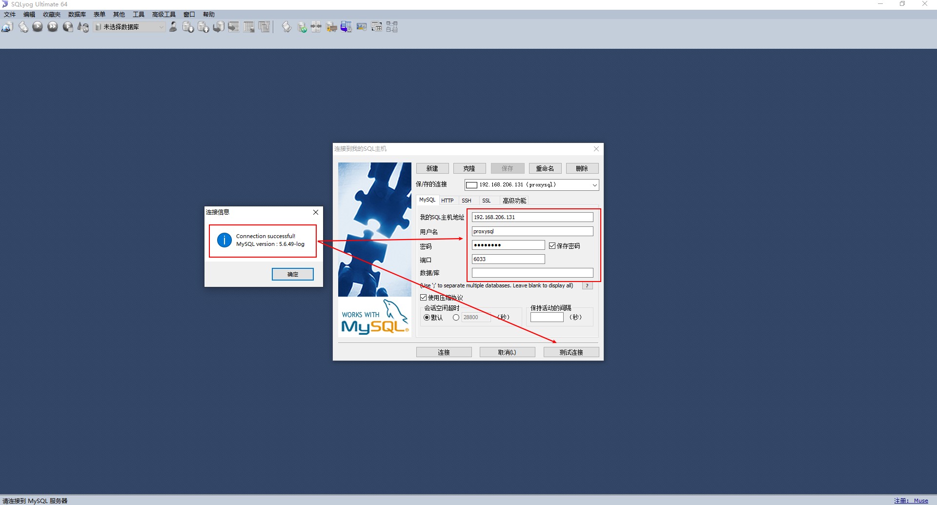 注意:在这里我使用图形化界面来操作,先测试是否连通,如果不能连上,请检查虚拟机防火墙是否关闭,那两个用户是否配对,如果Mycat重启不成功,请使用ps -ef | grep mycat查看,然后使用kill强制杀死,再然后重新启动,如果不知道什么问题,请使用前台运行,它会显示出错误信息,然后再解决