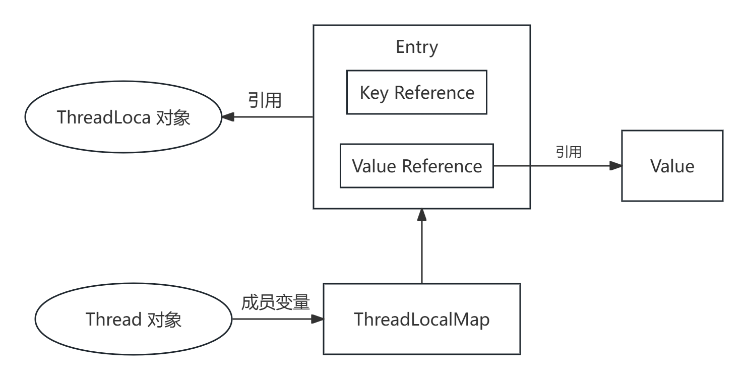 - 数组中的每个 Entry 都有一个键值对,其中键是 ThreadLocal 对象的弱引用,值是线程的局部变量。