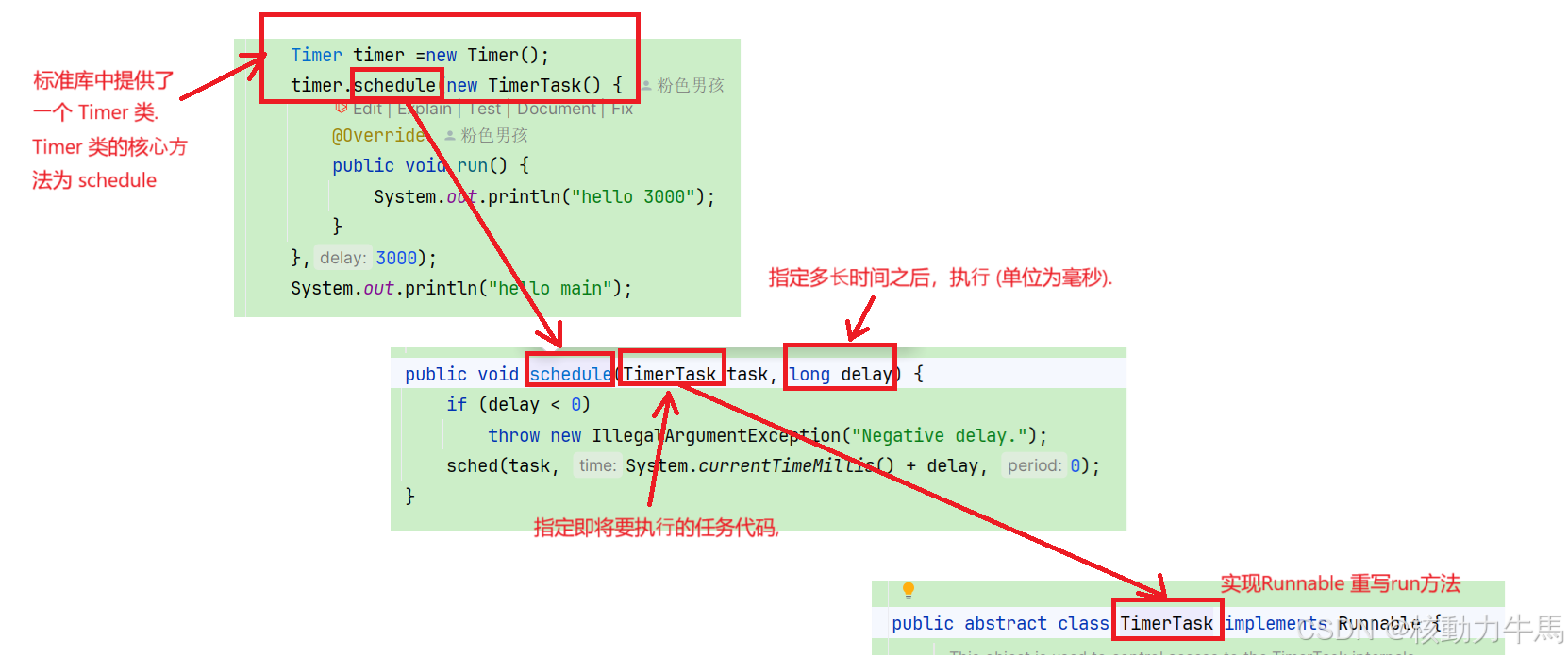 1. Timer 类提供的核⼼接⼝为 schedule, ⽤于注册⼀个任务, 并指定这个任务多⻓时间后执⾏.
