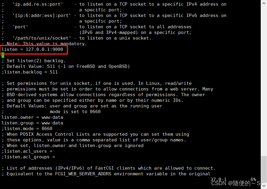 取消所选框字段的注释 listen.allowed_clients 字段是允许监听的服务端,这里设为只允许本机监听,否则会触发 php-fpm服务的未授权访问漏洞。