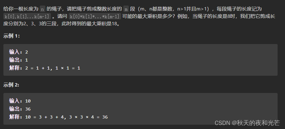 算法第一题:python实现剪绳子 1 题目描述:2 思路:不管是哪种语言,思路才是最重要的。分析:2.1 一个绳子剪的各部分长度乘积要最大,那么尽可能要染个这几个数字接近(数学知识,或许你可以想到均值不等式吧)。2.2 通过所给的案例我们可以发现,最长的部分就是对该绳子长度开根号并+12.3 既然最长部分出来了,那么对剩下的绳子长度我们又可以看作一根新的绳子2.4 因此,我们想到了用递归:递归三部曲是什么呢?(1)递推关系:每个新绳子的最长部分*F(减去最长部分后剩下绳子的长度)(2)递归结束条件:如..