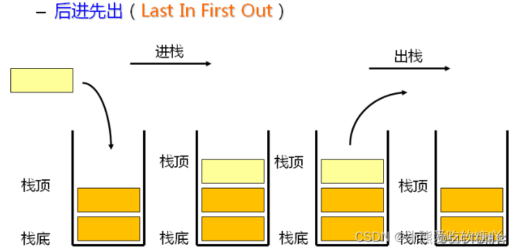 栈:一种特殊的线性表,其只允许在固定的一端进行插入和删除元素操作。进行数据插入和删除操作的一端称为栈顶,另一端称为栈底。栈中的数据元素遵守后进先出LIFO(Last In First Out)的原则。
