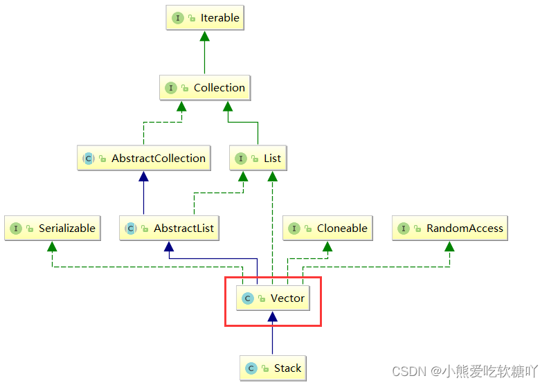 Stack继承了Vector,Vector和ArrayList类似,都是动态的顺序表,不同的是Vector是线程安