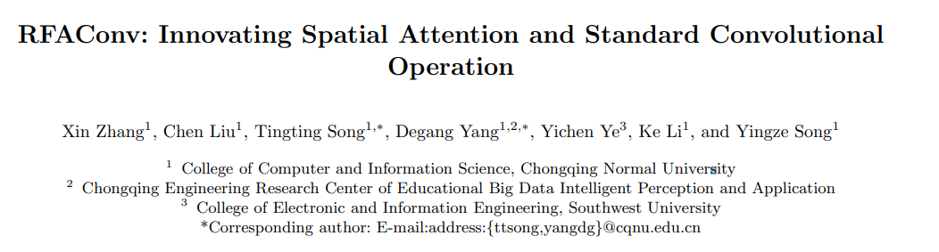 【YOLOv8改进-论文笔记】RFAConv:感受野注意力卷积,创新空间注意力 空间注意力已被广泛用于提升卷积神经网络的性能。然而,它存在一定的局限性。在本文中,我们提出了一个关于空间注意力有效性的新视角,即空间注意力机制本质上是解决卷积核参数共享的问题。然而,由空间注意力生成的注意力图中包含的信息对于大尺寸卷积核来说并不充分。因此,我们提出了一种名为感受野注意力(Receptive-Field Attention,简称RFA)的新型注意力机制。