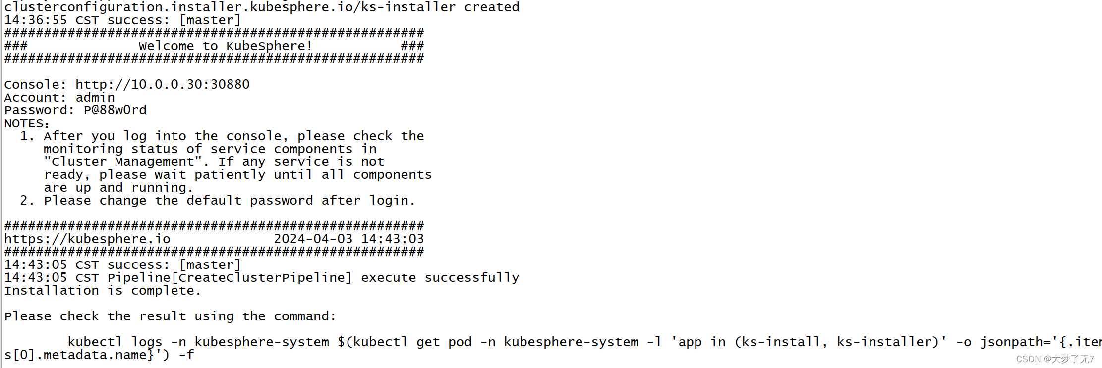 如果出现了k8s集群安装成功了,kubesphere长时间没有安装成功可以ctrl+c停止安装,使用以下命令重新安装,不用指定离线包了。