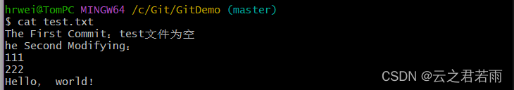 我们对test.txt做第一次修改并添加到暂存区,最后提交给本地仓库。test.txt的内容如图: