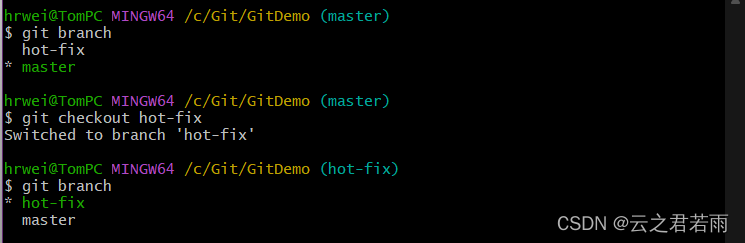 git branch <branchname>命令创建一个新的分支:git branch hot-fix该命令会在当前所在的提交上创建一个名为hot-fix的新分支