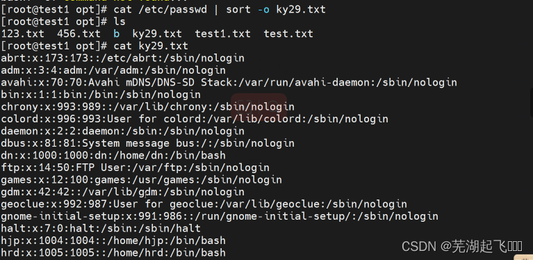 这个命令将 /etc/passwd 文件的每一行进行编号,并将编号后的内容输出到屏幕上。同时,它还会将输出结果按照行号进行升序排序,并将排序后的结果保存到名为 ky29.txt 的文件中。