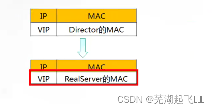 路由器收到ARP请求后,将更新ARP表项 原有的VIP对应Director的MAC地址会被更新为VIP对应RealServer的MAC地址