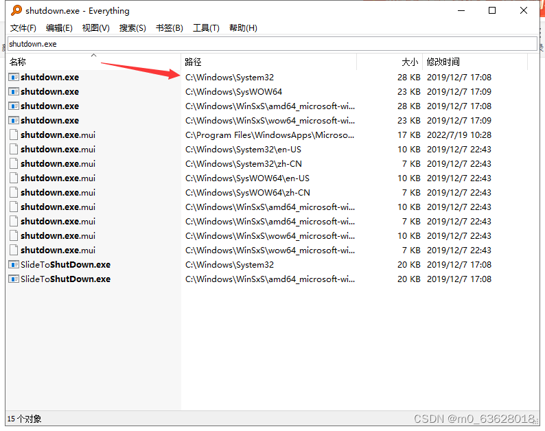 1、在 Everything 找到系统 shutdown.exe 脚本,拷贝该路径