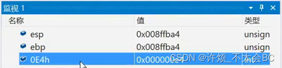 通过监视我们可以发现,此时esp和ebp的值已经一模一样了,说明ebp已经移到 _tmainCRTSstartup函数的栈顶了,并且esp的值也发生了变化,如图所示: