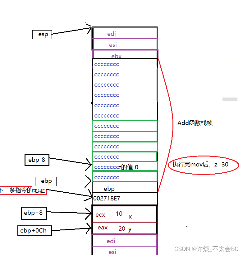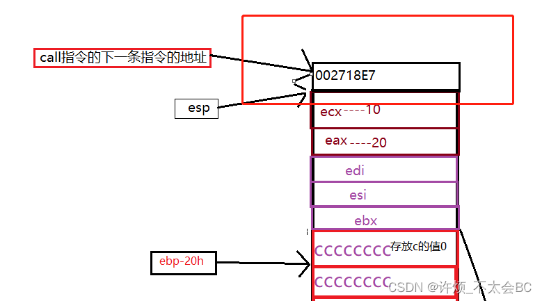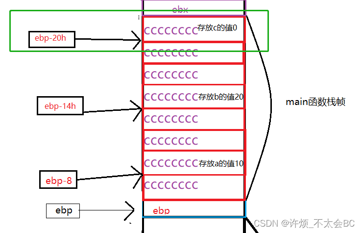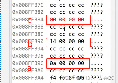 int a = 10; 002718C5 mov dword ptr [ebp-8],0Ah int b = 20; 002718CC mov dword ptr [ebp-14h],14h int c = 0; 002718D3 mov dword ptr [ebp-20h],0 c = Add(a, b);这里是创建a,b,c三个变量,假设我们用一个格子代表4个字节,那么创建的a,b,c三个变量如下图所示: