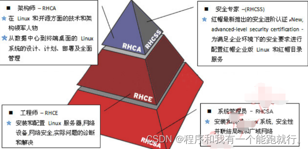 RHCSA英文全称:Red Hat Certified System Administrator ,中文全称:红帽认证系统管理员 RHCE英文全称:Red Hat Certified Engineer,中文全称:红帽认证工程师。 RHCA英文全称:Red Hat Certified Architect,中文全称:红帽认证架构师。 RHCSS英文全称:Red Hat Certified Security Specialist,中文全称:红帽认证安全专家。 RHCDS英文全称:Red Hat Certified Datacenter Specialist ,中文全称:红帽认证数据中心专家。 RHCVA英文全称:Red Hat Certified Virtualization Administrator,中文全称:红帽企业虚拟化管理 红帽 OpenStack 认证工程师 红帽 OpenStack 认证系统管理员