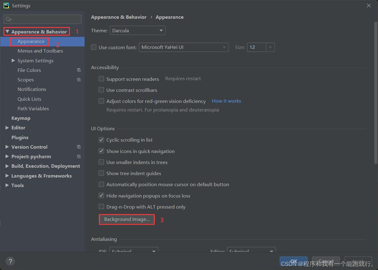本文介绍了如何在PyCharm中设置背景图片和颜色,包括选择背景图片,调整透明度和对称方式,以及切换不同主题风格,如默认白色、黑色高亮模式等。