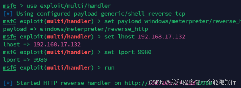 调用 exploit/multi/handler 模块,在该模块上配置 HTTP Payload,为该 payload 的 IP 和 端口设置成 Metasploit Framework 所在主机 IP,端口自定义即可。之后运行该模块