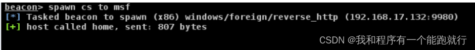 监听 IP 和端口设置成刚才 Metasploit Framework 上所监听的 IP 和端口,接着在 Cobalt Strike 上右击选择要传递的会话,找到 Spawn 选项,选择刚刚创建的监听器即可
