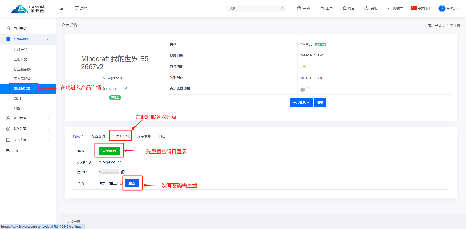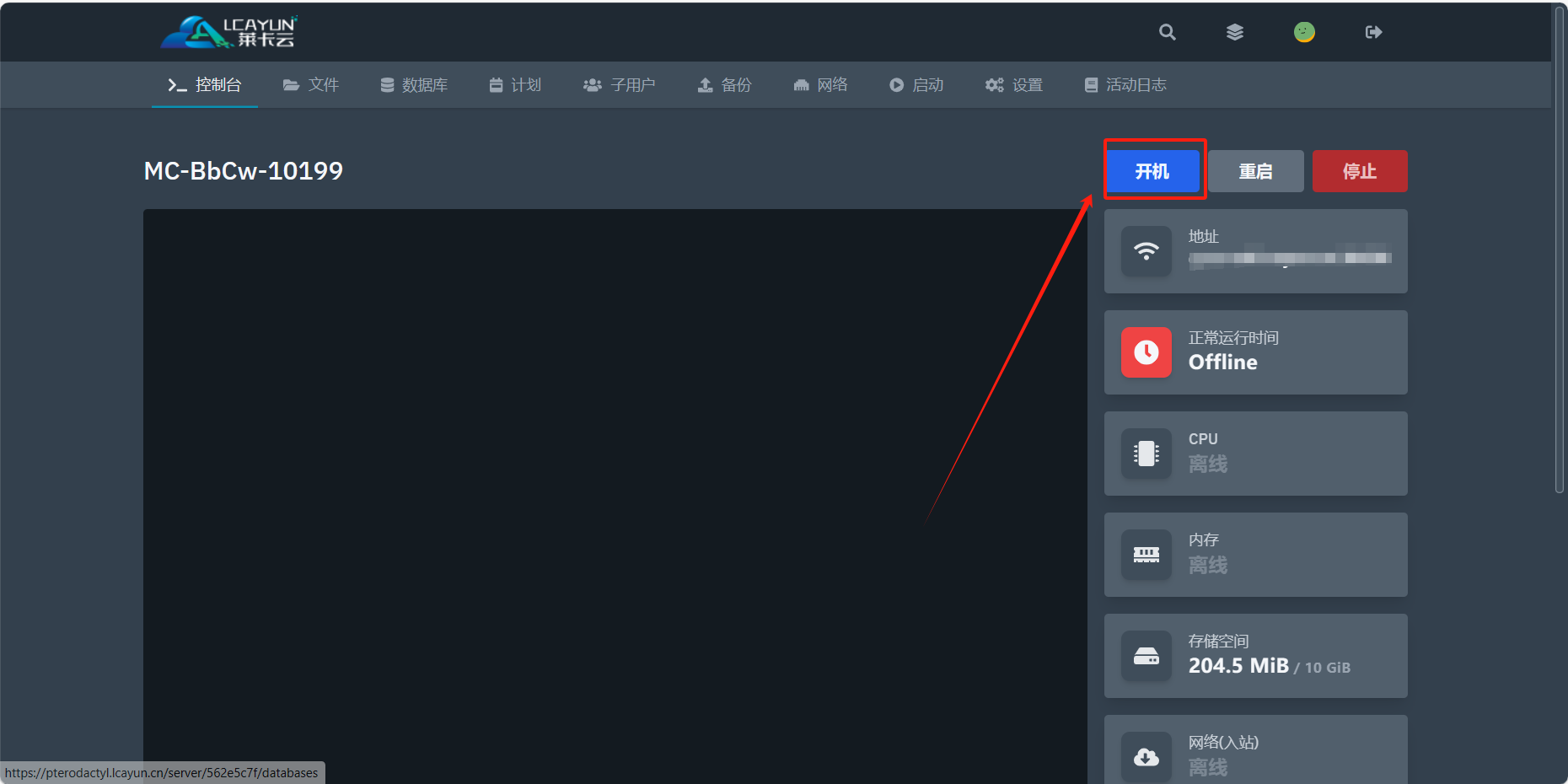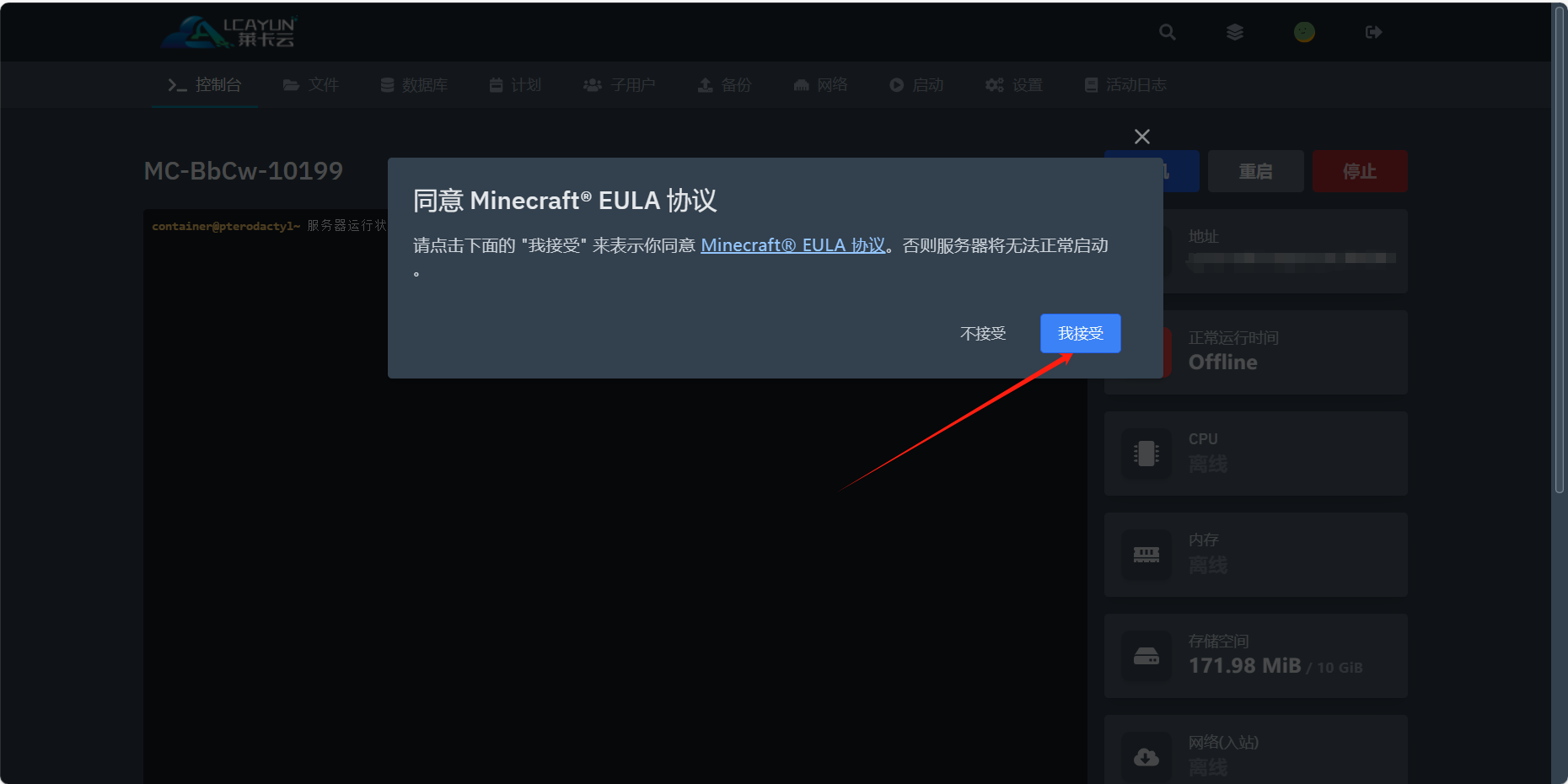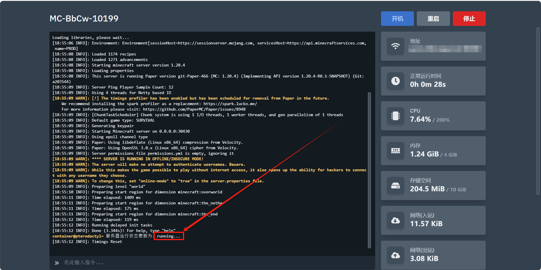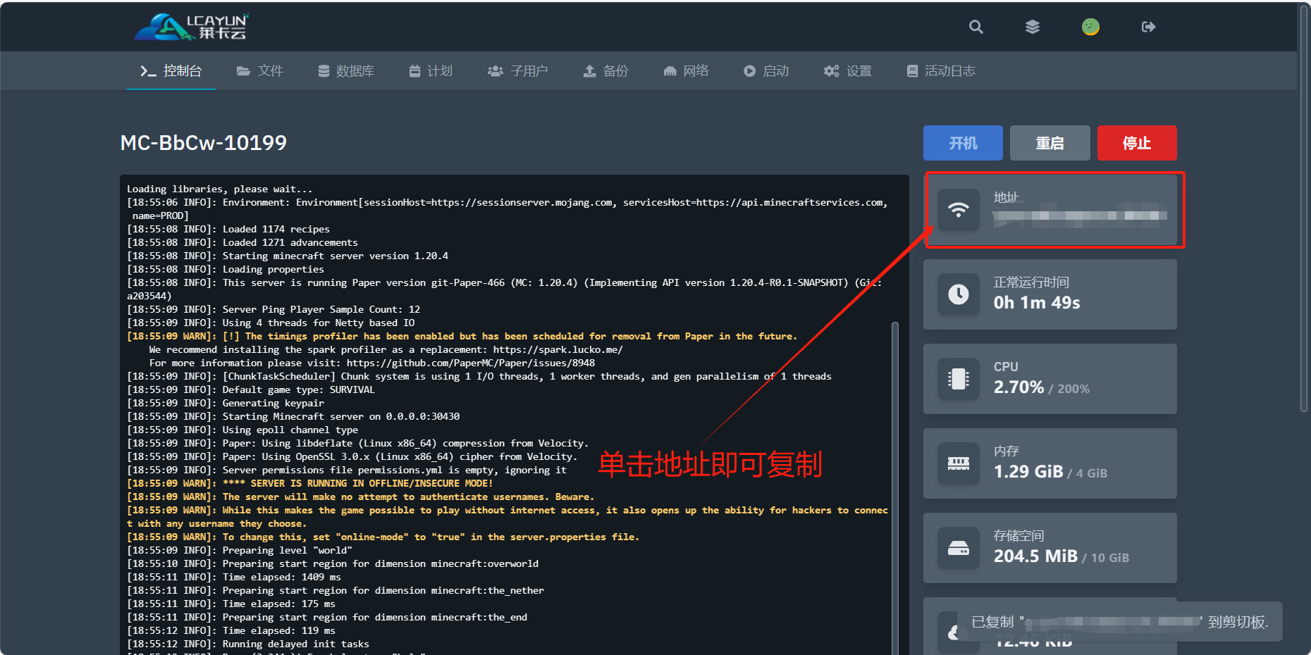 本教程使用Paper核心开服 1、进入控制面板 1.2、第一次购买服务器会安装游戏端,大约5分钟左右,如果长时间处于安装状态请联系客服 2、开启服务器 2.1、等待出现同意Minecraft® EULA 协议时,点击“我接受” 2.2、等待running出现服务器就打开了 3、连接游戏 复制服务器地址 3.1、打开游戏