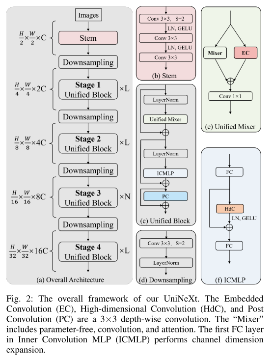 这篇论文提出了一种名为UniNeXt的统一架构,通过将空间令牌混合器与其他组件相结合,增加了网络的归纳偏差,包括在 STM 中添加并行的 EC 分支、在FFN添加 PC 模块以及在 FFN 中添加 3×3 的深度可分离卷积Hdc。最后,在广泛的实验中,作者验证了该框架的有效性,并呼吁研究人员关注宏观架构设计,而非仅仅是一些精心设计的模块(魔改?)。