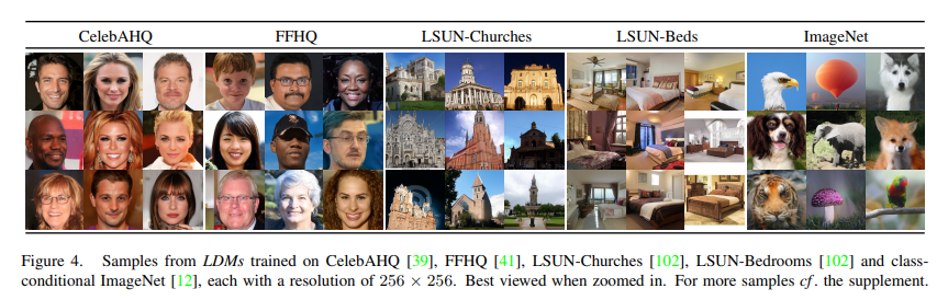 * 论文还提出了cross-attention的方法来实现多模态训练,使得条件图片生成任务也可以实现。论文中提到的条件图片生成任务包括类别条件图片生成(class-condition), 文图生成(text-to-image), 布局条件图片生成(layout-to-image)。这也为日后Stable Diffusion的开发奠定了基础。