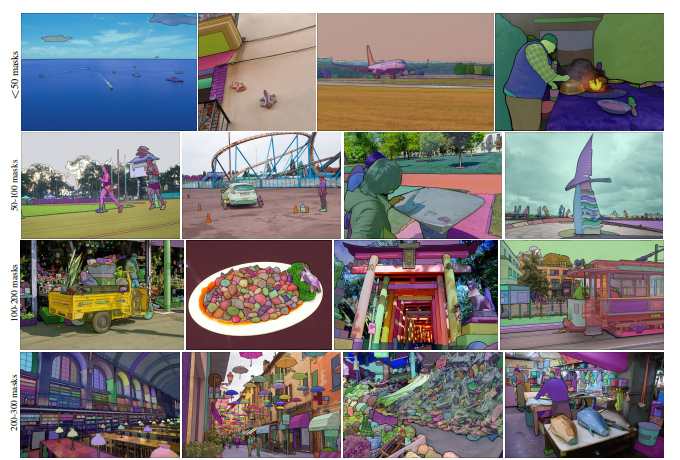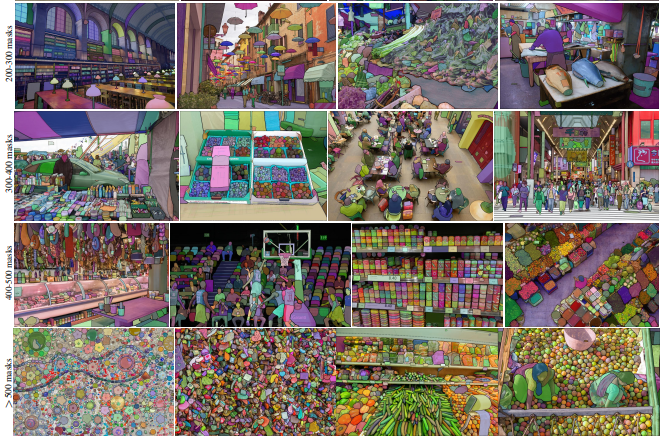 作者最终的数据集SA-1B包括1100万张获得许可和保护隐私的图像,一共的标注超过10亿个掩码。SA-1B使用作者的数据引擎的最后阶段完全自动收集,其掩码数量是任何现有分割数据集的400倍,而且正如作者广泛验证的那样,这些掩码具有高质量和多样性。除了用于训练SAM以使其健壮和通用外,作者希望SA-1B成为研究者构建新基础模型的有价值资源。