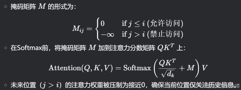 生成第 ii个位置的输出时,模型只能利用前 i−1个位置的已知信息,符合自回归生成的要求。