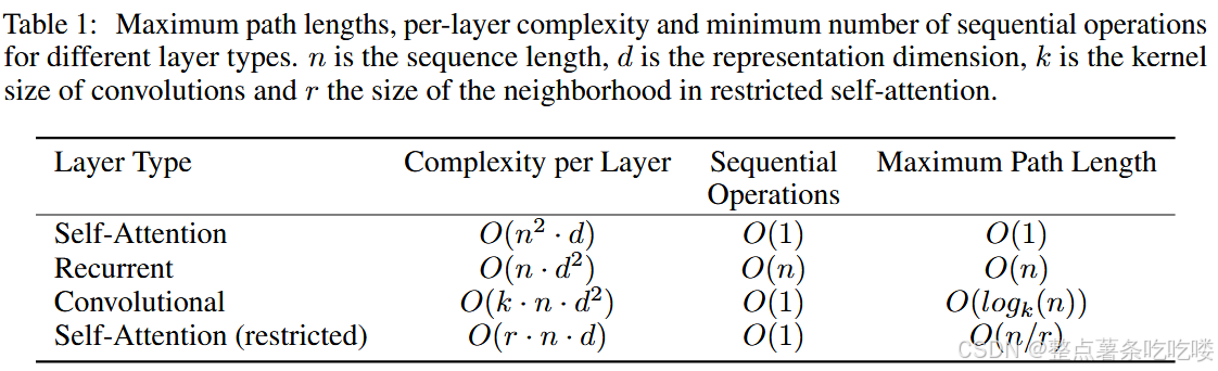 - 自注意力层将所有位置与常数个顺序执行操作相连,而循环层需要 𝑂(𝑛) 次顺序操作。
