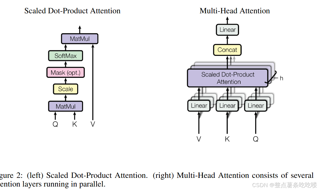 在这项工作中,采用 ℎ=8 个并行注意力层或头(head)。每个头都采用 𝑑𝑘=𝑑𝑣=𝑑model/ℎ=64 。由于每个头的维度减少,总计算成本与全维度的单头注意力相似。