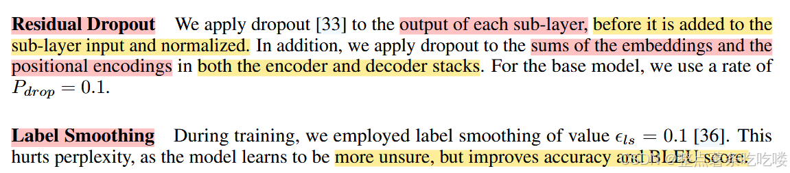 Dropout:应用于嵌入、注意力分数、FFN中间层及残差连接后;测试时需关闭Dropout或调整权重(如乘以1−p1−p)。