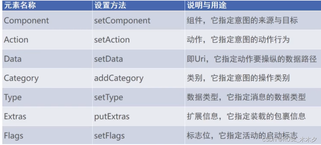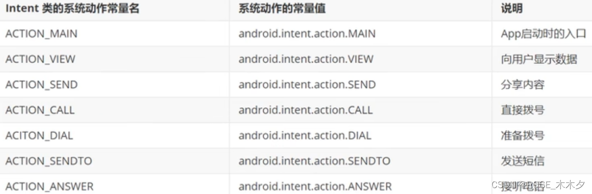 然后下面是我搜到的Intent的组成部分和常见系统动作取值: